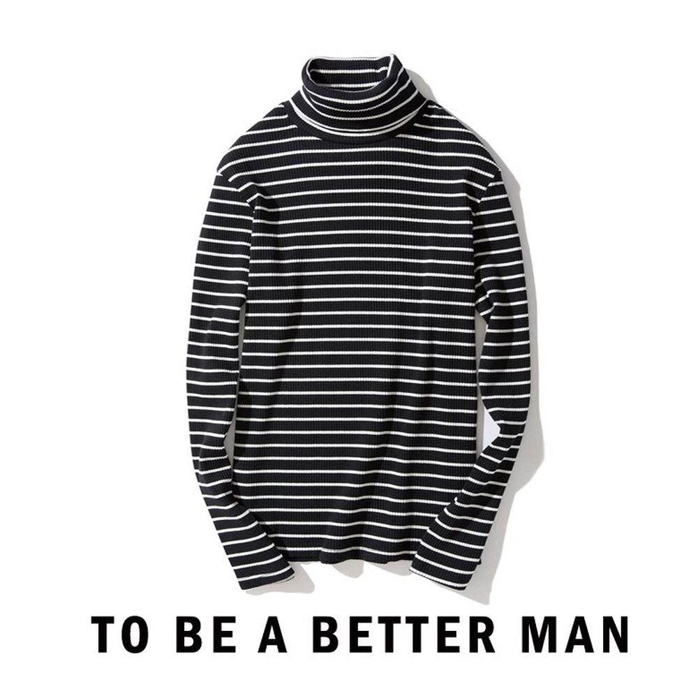 Black and White Striped T-shirt Men's Retro Base Layer High Neck Long Sleeve