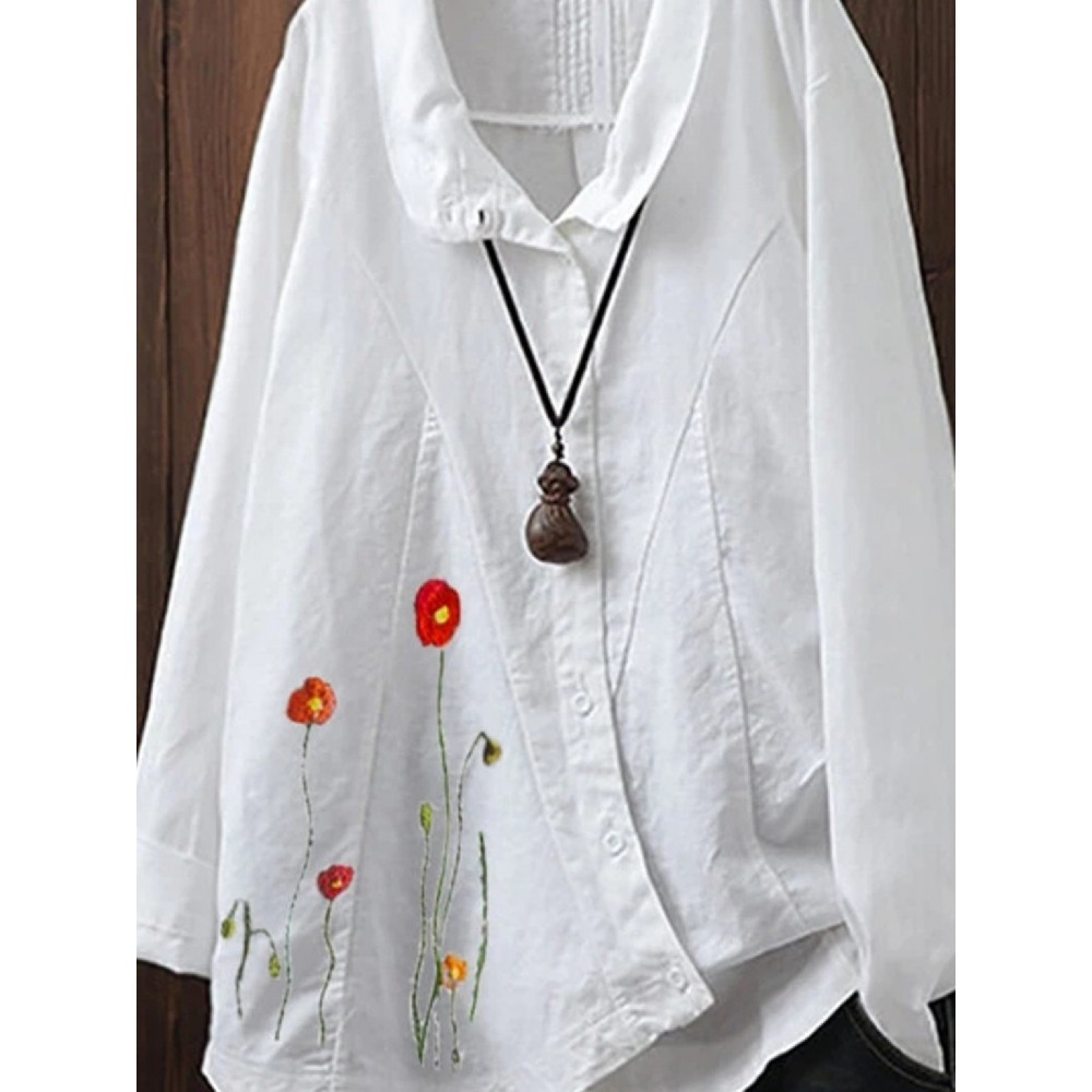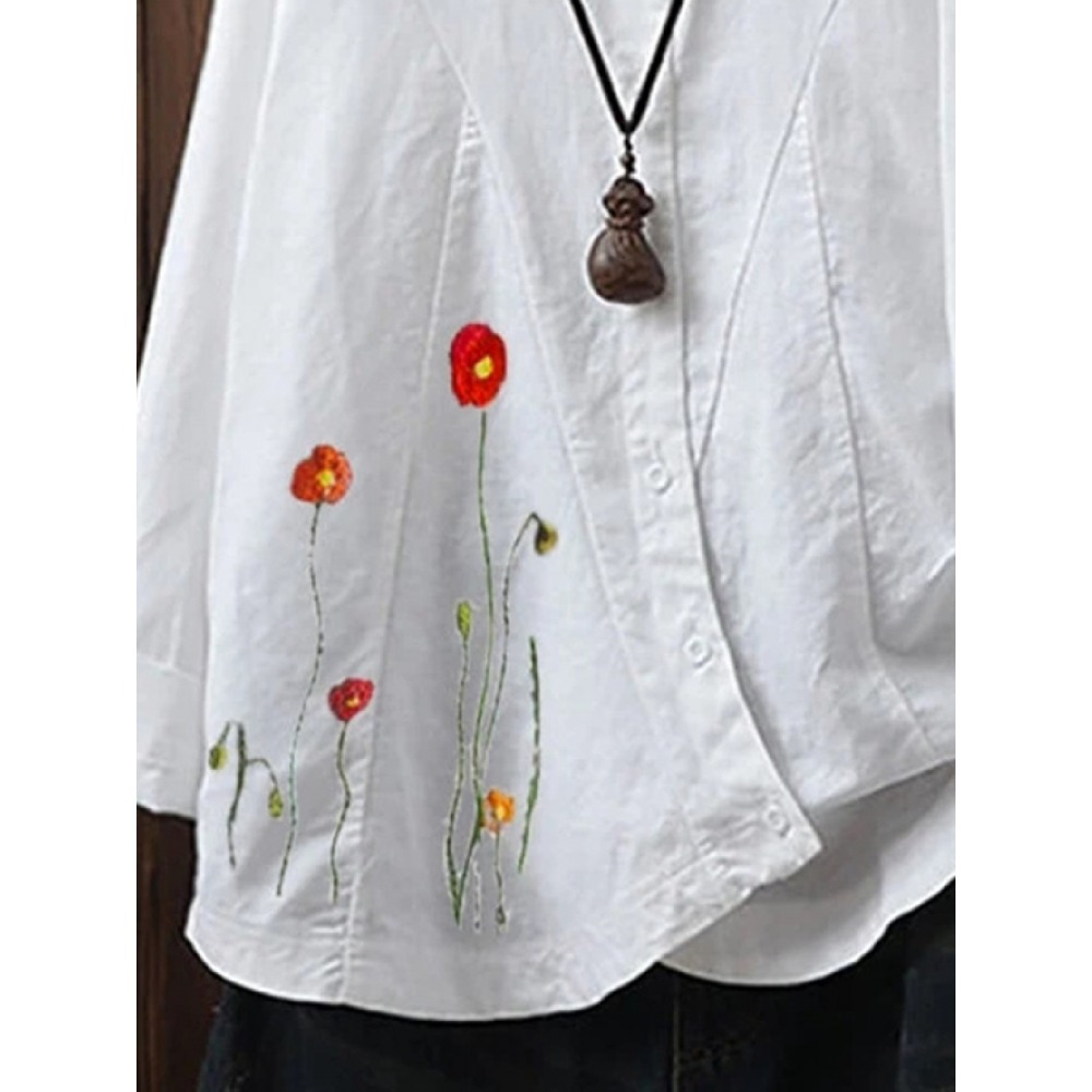 Summer Hot Embroidered Cotton Linen Short Sleeve Loose Casual Button T-Shirt Women